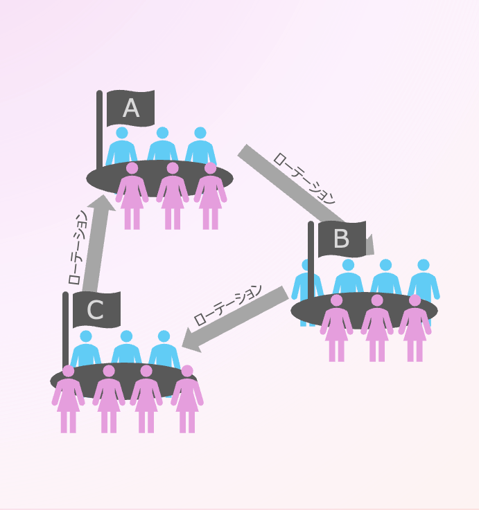 6~7人規模のグループを作り、そのグループ内で自己紹介を含めたコミュニケーションの時間を設けます。
